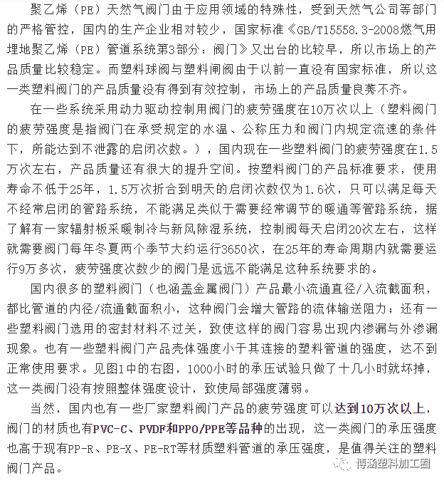 市场情况、产品质量现状、市场需求、产品标准要求、塑料阀门种类和应用优势。以表格的形式给出了塑料阀门各种产品的全开阀门、全径阀门与缩径阀门最小流通面积的数值要求;同时也给出了不同温度下阀体材料的温度折减系数和公称通径的对照关系。通过已经发布塑料阀门产品的国家标准号的了解,可以使塑料阀门的生产者和使用者都有依据。