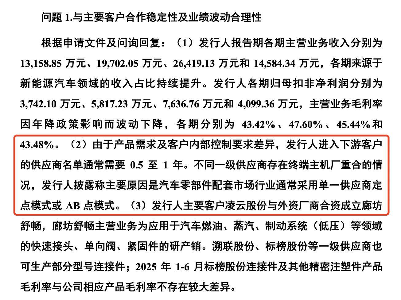 根据申请文件及问询回复:由于产品需求及客户内部控制要求差异,公司进入下游客户的供应商名单通常需要0.5至1年。不同一级供应商存在终端主机厂重合的情况,公司披露称主要原因是汽车零部件配套市场行业通常采用单一供应商定点模式或AB点模式。